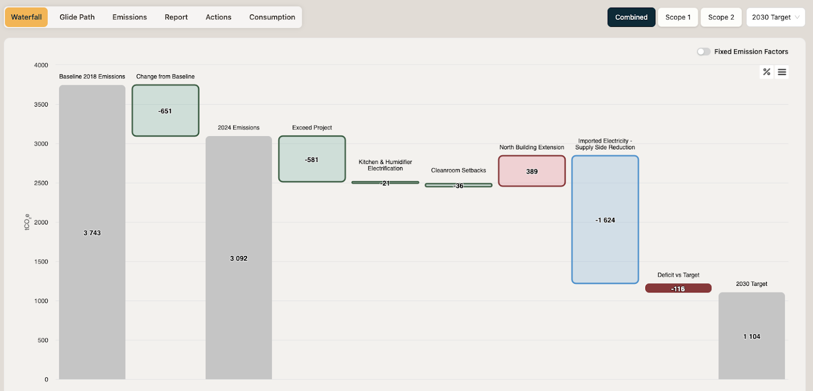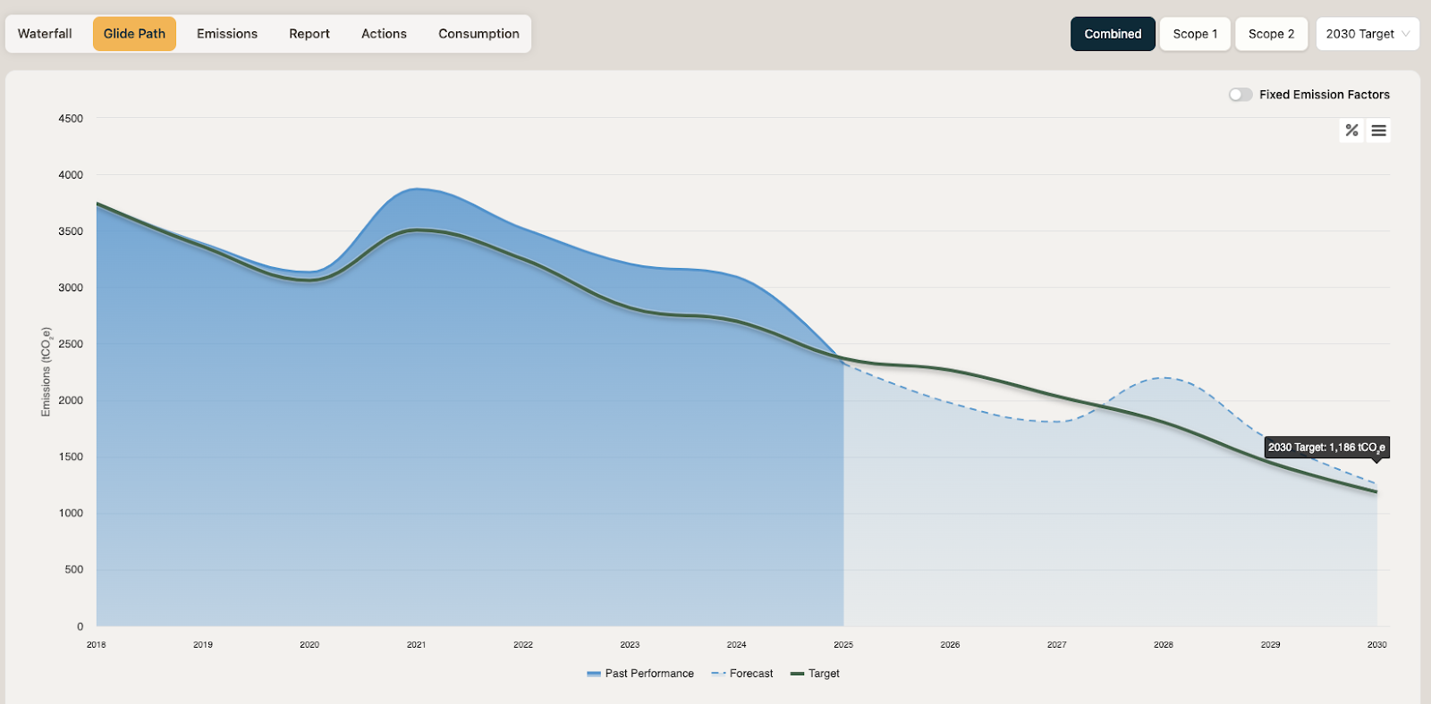 Model and compare multiple decarbonisation scenarios with the glidepath feature. Test different strategies — from electrification to renewables — and see how each affects timelines, costs, and emissions.